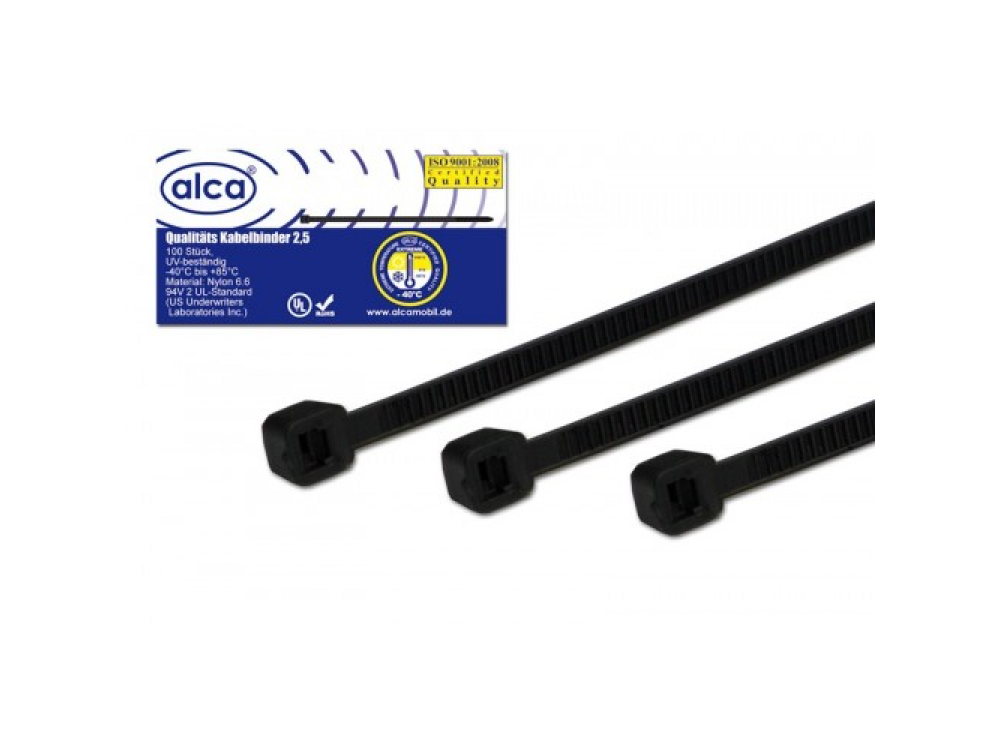 Хомут—стяжка кабельная пластиковая W2.5 L200, цвет черный, 100 шт. в упаковке, температура эксплуатации от — 40 до + 85, материал нейлон, устойчивость к окислению и травлению.