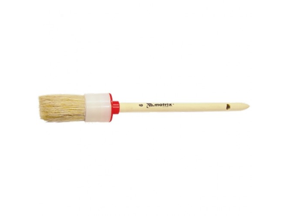 Ворс кисти из натуральной светлой щетины, расщепленной на концах. Диаметр кисти от 20 до 65 мм. Щетина кисти надежно закреплена пластмассовым бандажом. Ручка изготовлена из дерева. Кисть предназначена для работ с масляными красками и лаками, устойчива к агрессивным составам. Применяется для окраски и грунтовки небольших по площади поверхностей.