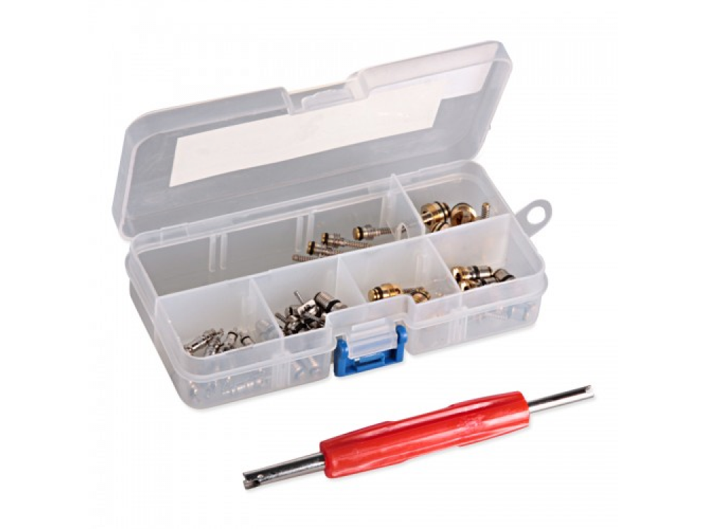 Универсальный ниппель х 10шт. Универсальный ниппель под R134A х 10шт. Ниппель под низкое давление 8 мм х 5 шт. Ниппель под высокое давление 10 мм х 5 шт. Ниппель для Peugeot/Volvo х 5 шт. Ниппель для GM х 5 шт. Отвертка для ниппелей х 1 шт.