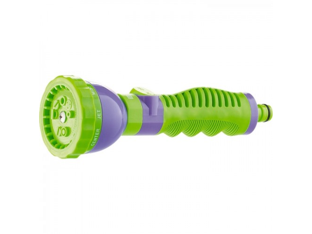 Распылитель со штуцерной посадкой. Оснащен регулируемой форсункой, что обеспечивает девять режимов полива: плоско-вертикальную струю, струю под углом, душ, плоско-горизонтальную струю, конусное распыление, центральное распыление, жесткую струю, туман, сочащийся режим. Имеет клавишу подачи/остановки напора.