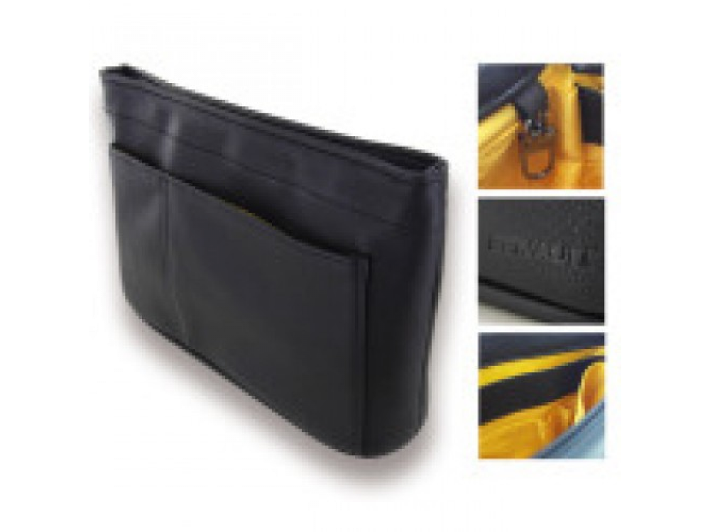 Из зернистой кожи кожи. Закрывается на магнитный замок. Имеет множество отсеков. Брелок с карабином внутри. Желтая подкладка из хлопка. Цвет: черный / желтый. Тиснение логотипа Renault на передней стороне сумки. Размеры: 225 x 155 x 65 мм. Поставляется в подарочной коробке Renault.