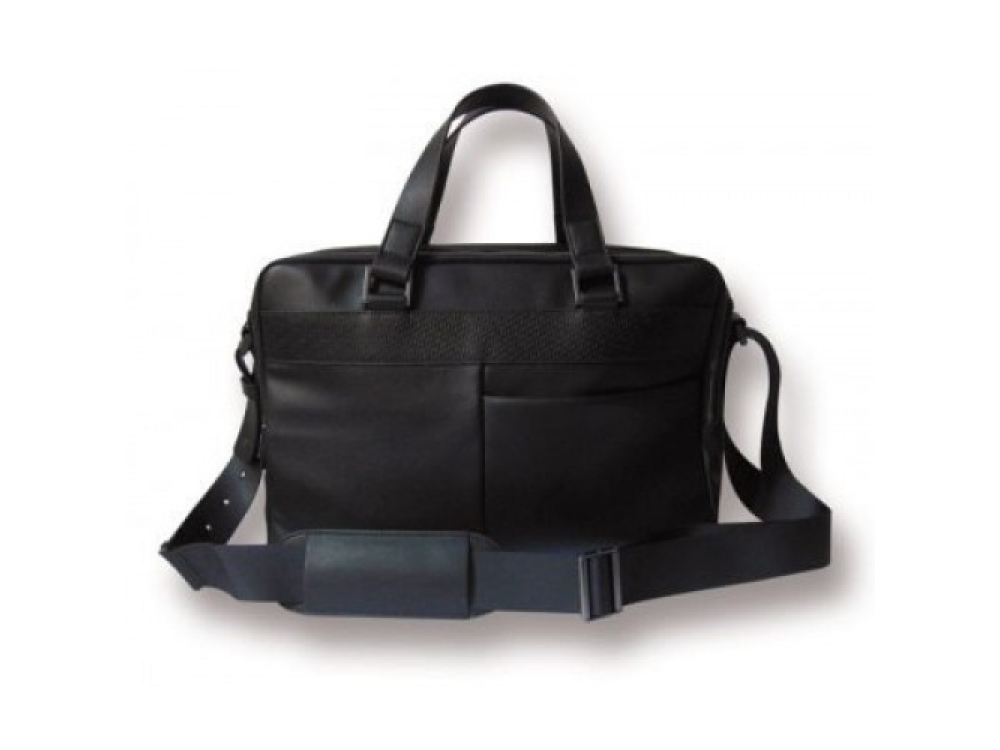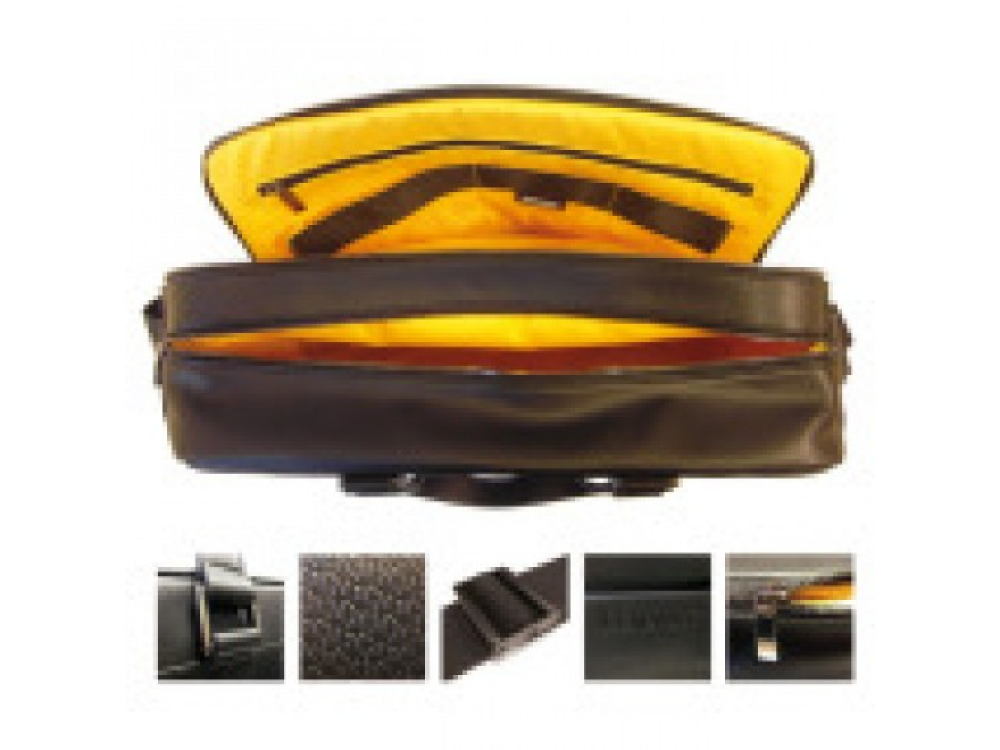 Из зернистой кожи. Основной отдел закрывается молнией. Другие карманы на магнитной застежке. Съемный ремень с металлическими пряжками. Подкладка из хлопка. Цвет: черный / желтый. Логотип Renault тиснением на передней стороне и алмазной рамкой на другой. Размеры: 42 x 28 x 13 см. Есть возможность продеть через ручеку чемодана. Поставляется в защитном чехле Renault.
